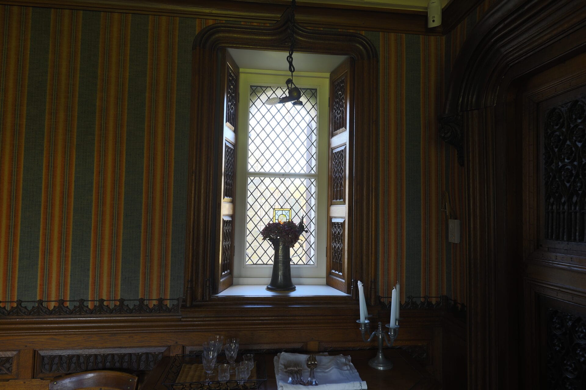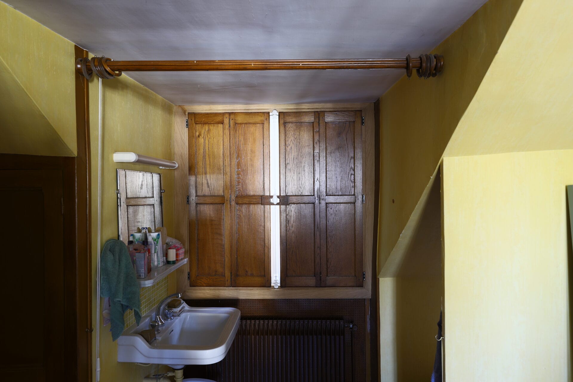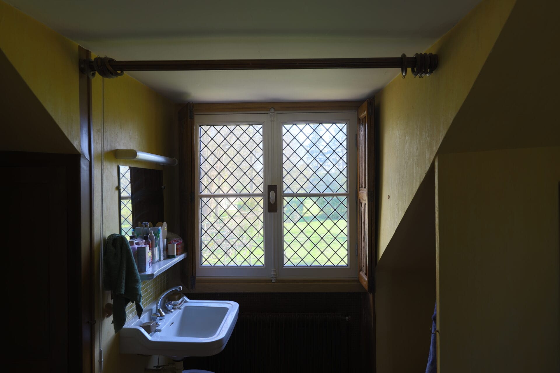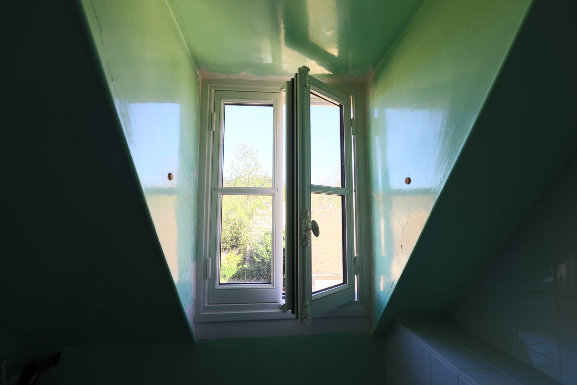 La fenêtre de la salle de bains du deuxième étage faisant 750 mm de largeur totale à 2 vantaux et mouton et gueule de loup ne pouvait pas être fabriquée par un industriel. Il aurait fallu sinon la passer en une fenêtre à 1 vantail. Nous avons conçu une fenêtre à 2 vantaux à mouton et gueule de loup s'ouvrant avec un double vitrage 4/16 Argon/4FE et ayant 2 joints d'étanchéité même dans le battement. Le battement à mouton et gueule de loup fait 109 mm de large et les montants de ferrage sont affinés à l’extrême tout en conservant un tenon et mortaise. Cette fenêtre paraît anodine mais c'est concentré de difficulté mécanique et technique.