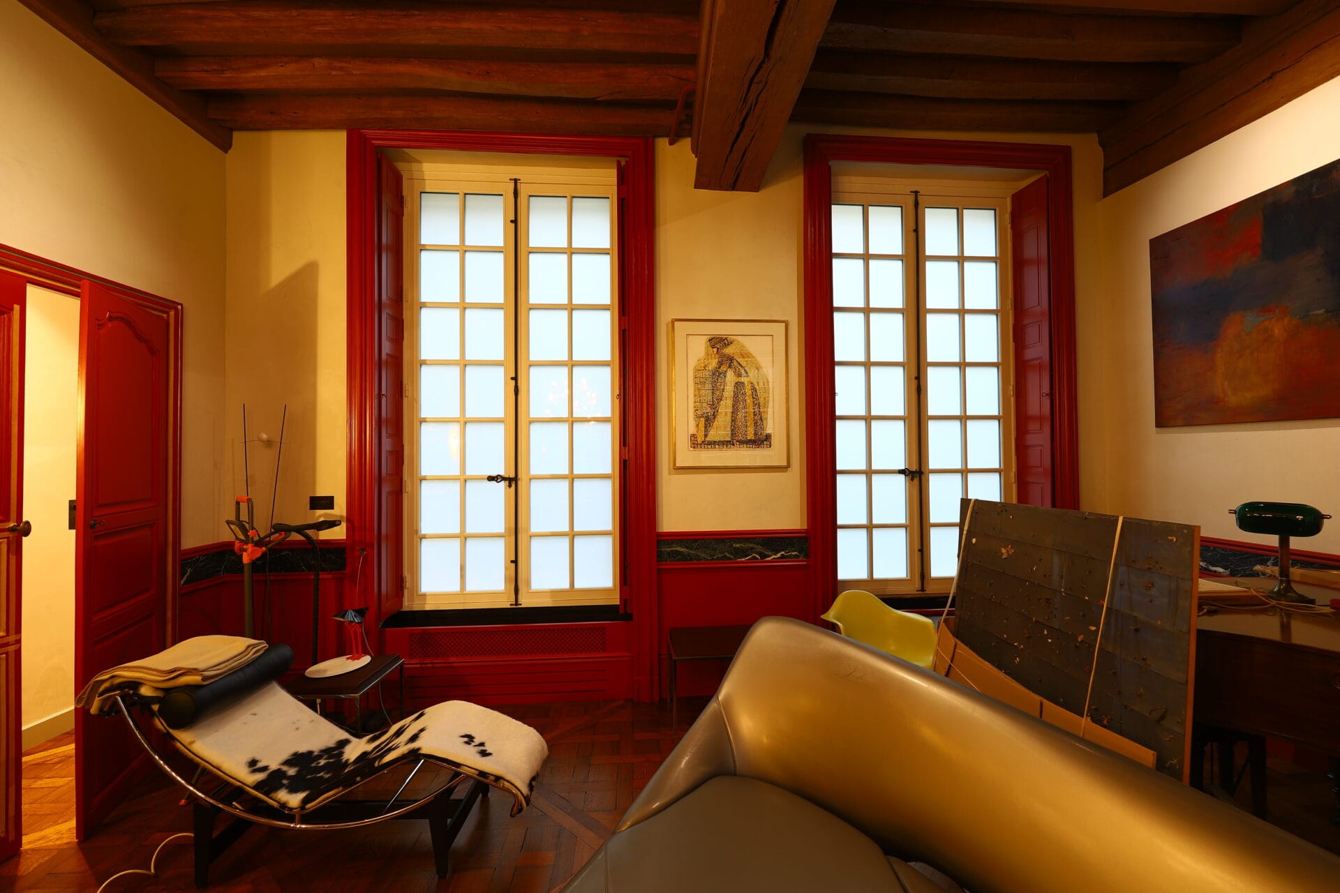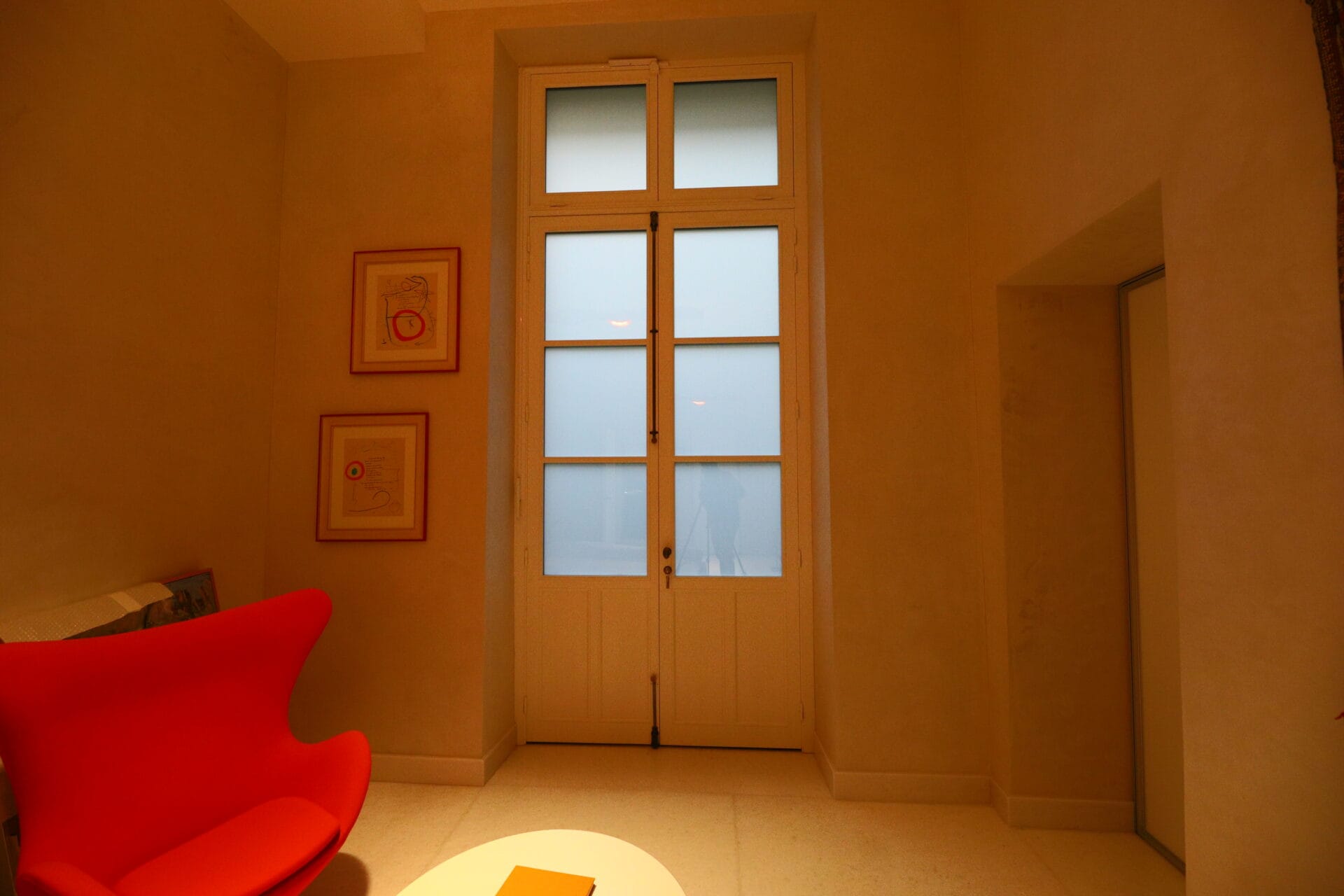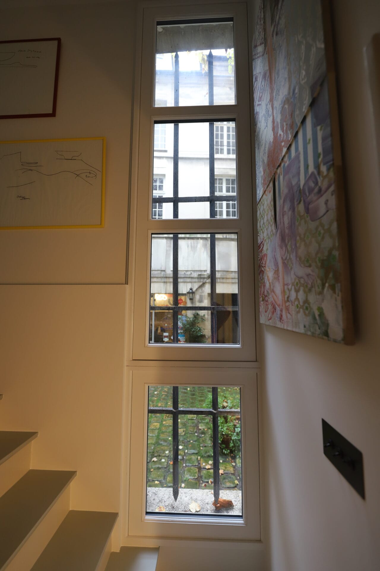 Les menuiseries extérieures étaient à simple vitrage. La demande était de reproduire l'architecture à l'identique en ayant des vitrages anti-effraction d'une certaine teinte de verre et pour partie polarisant. La difficulté de ce projet résidait dans la hauteur des menuiseries (en moyenne ouvrant de plus de 2800 mm de haut), l'intégration de vitrage très performant thermiquement, très résistant à l'effraction et permettant une intimité choisie, l'intégration de domotique tant le contrôle d'accès que dans l'anti-effraction tout en conservant la quincaillerie ancienne.