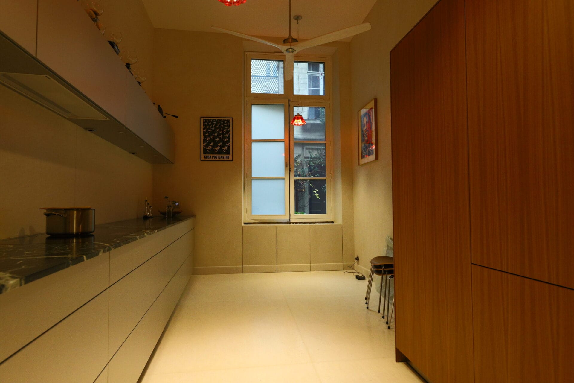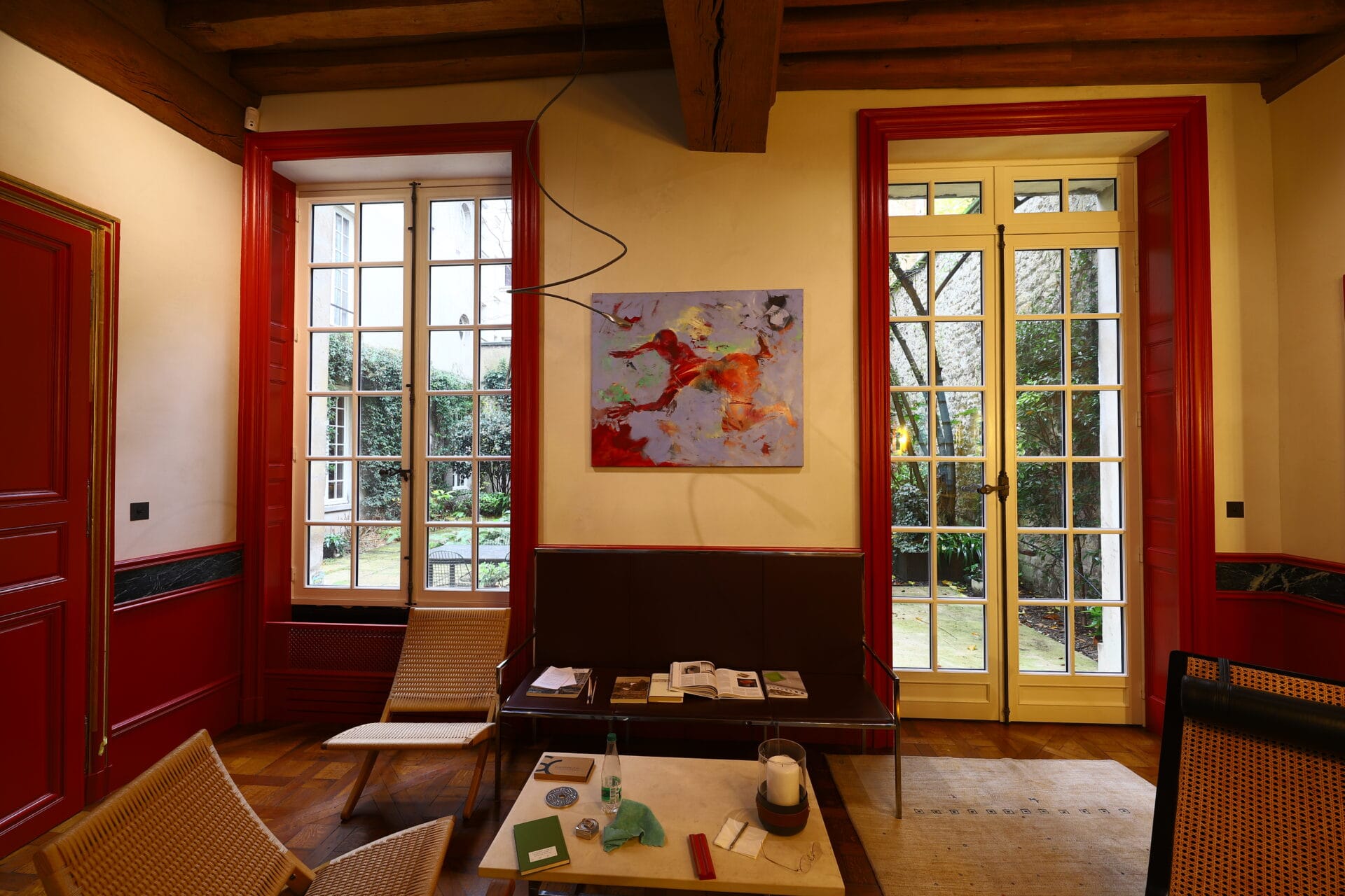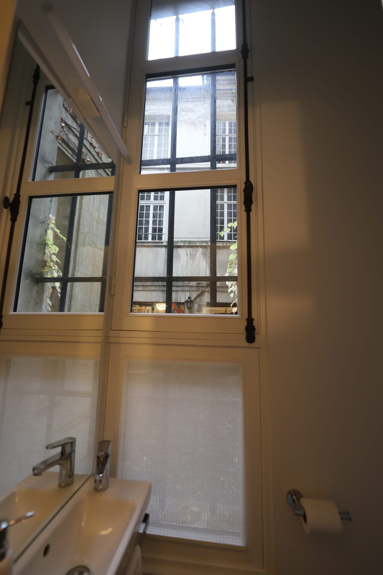Les menuiseries extérieures étaient à simple vitrage. La demande était de reproduire l'architecture à l'identique en ayant des vitrages anti-effraction d'une certaine teinte de verre et pour partie polarisant. La difficulté de ce projet résidait dans la hauteur des menuiseries (en moyenne ouvrant de plus de 2800 mm de haut), l'intégration de vitrage très performant thermiquement, très résistant à l'effraction et permettant une intimité choisie, l'intégration de domotique tant le contrôle d'accès que dans l'anti-effraction tout en conservant la quincaillerie ancienne.