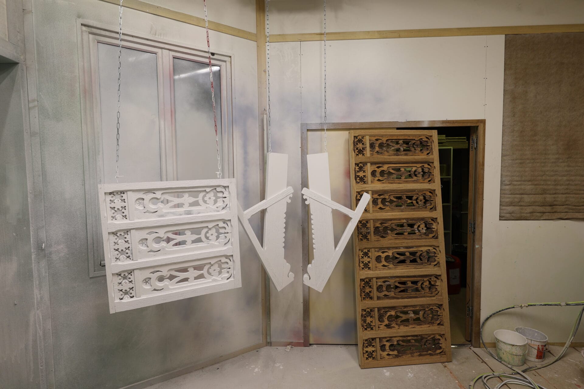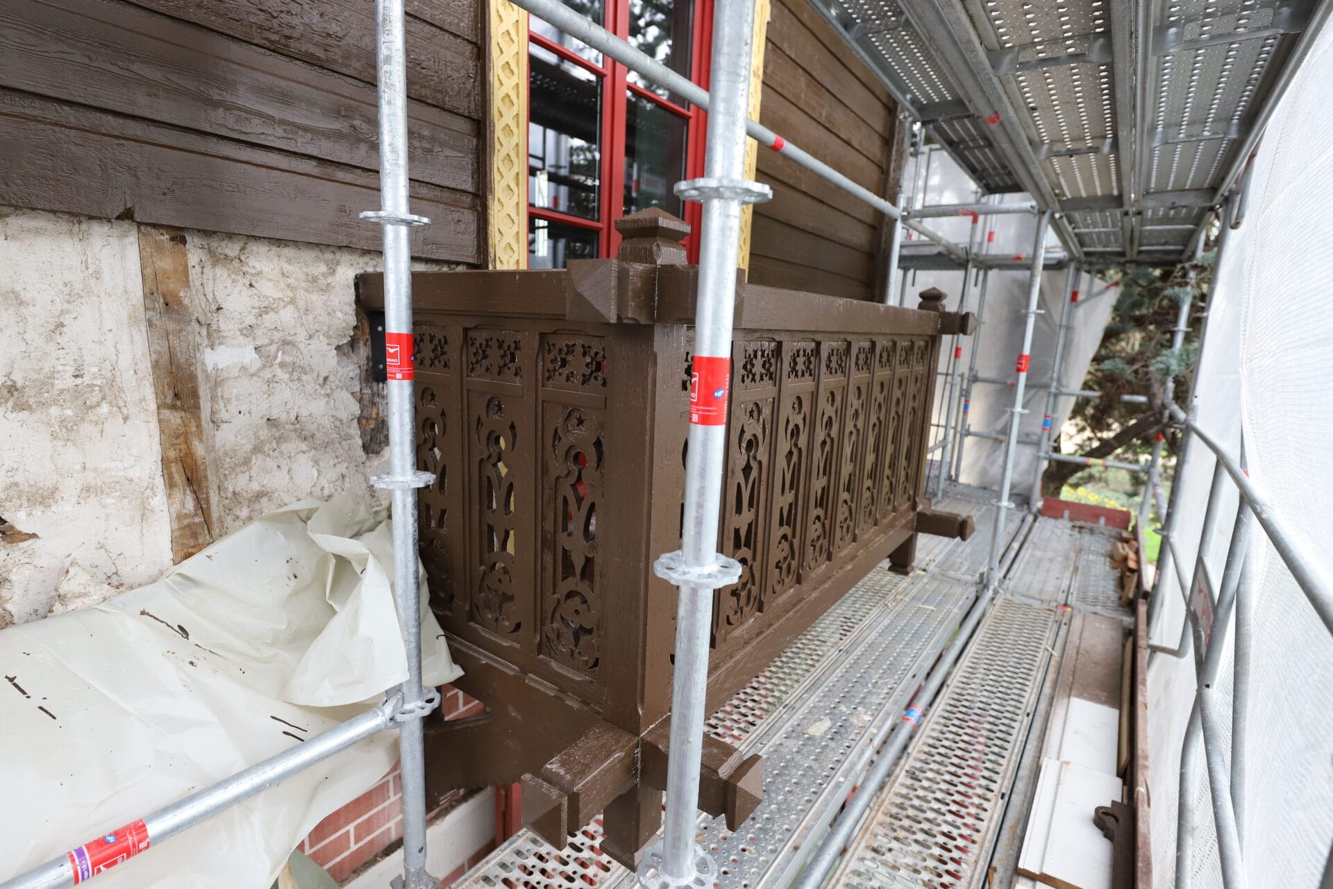 Les balcons latéraux étaient fortement dégradés. Nous avons pu uniquement conserver les panneaux de remplissage chantournés. Les restes, soit la partie structurelle étaient trop dégradés pour être conservée ou restaurée.